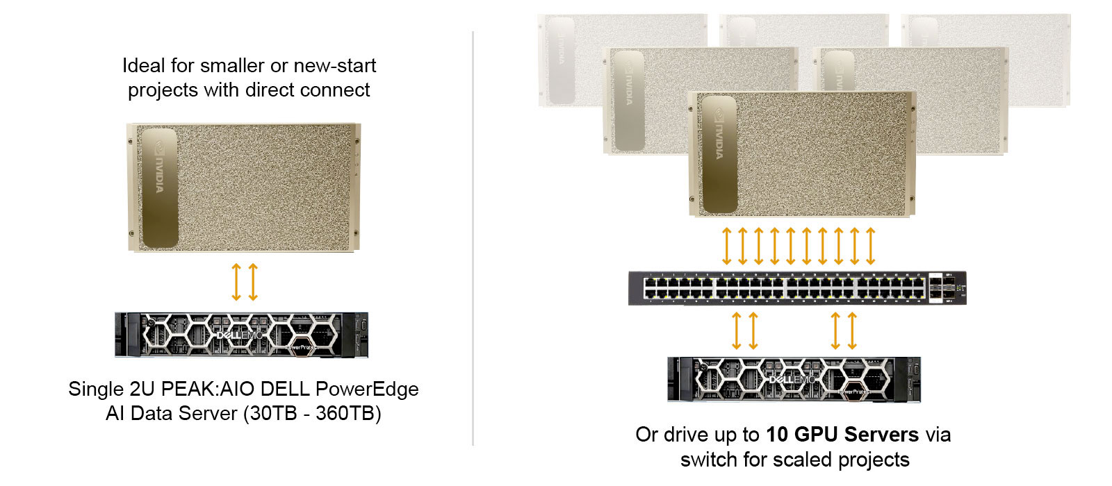 This diagram illustrates a typical AI cluster using a Dell AI Data Server powered by PEAK:AIO. Often early concept projects use only one server, PEAK:AIO can work directly connected, removing the cost of the switch at this initial stage. As the compute scales, the simple addition of a switch enables the PEAK:AIO solution to serve up to 10 GPU servers such as the NVIDIA DGX A100’s shown below.